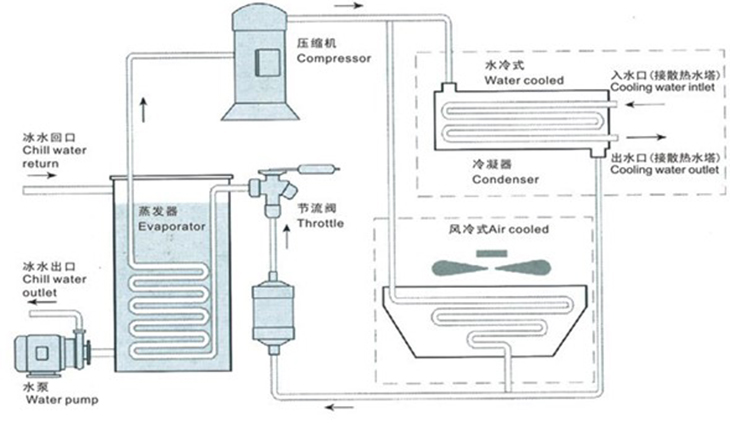 風(fēng)冷式冷水機(jī)是將常溫的水通過(guò)冷水機(jī)制冷到一定的溫度以強(qiáng)化冷卻模具或機(jī)器,作為單機(jī)使用,散熱裝置為內(nèi)置之風(fēng)扇,主要有三個(gè)相互聯(lián)系的系統(tǒng):制冷劑循環(huán)系統(tǒng)、水循環(huán)系統(tǒng)、電器自控系統(tǒng)。