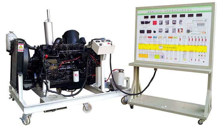 柴油發(fā)動機(jī)總成、組合儀表、發(fā)動機(jī)控制單元、散熱系統(tǒng)(水箱、風(fēng)扇、上下水管)、排氣系統(tǒng)、進(jìn)氣系統(tǒng)(進(jìn)氣軟管、空氣濾清器總成)、原車電路原理圖板及檢測端子面板、蓄電池、電源總開關(guān)、燃油箱、油水分離器、油門踏板裝置、可移動機(jī)臺架、臺架高溫及轉(zhuǎn)動等部位加裝防護(hù)裝置等。