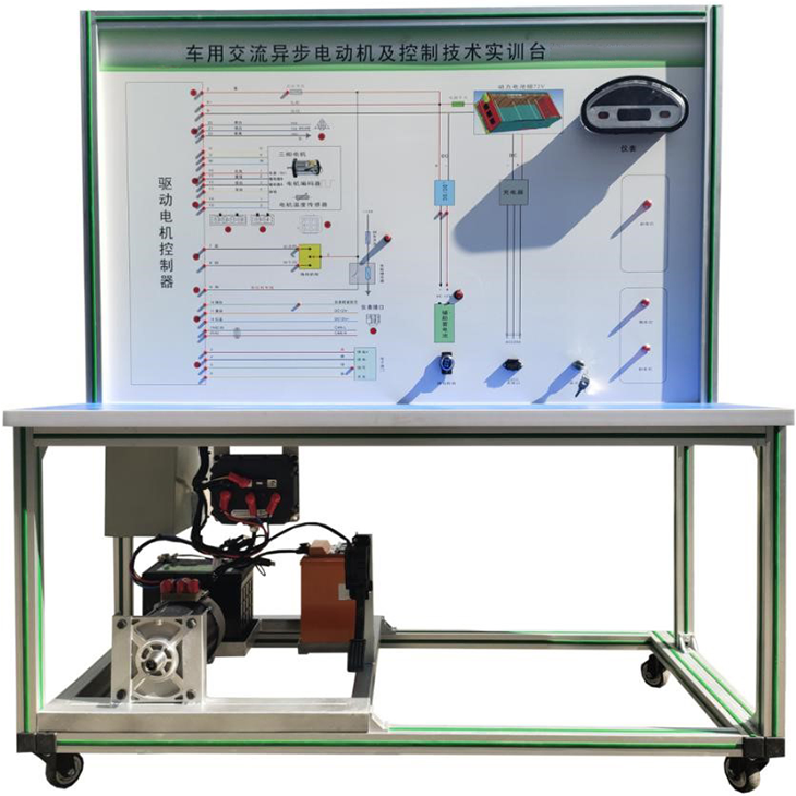 檢測控制面板(裝有各種檢測端子,1448×940mm彩色電路圖和工作原理示意圖)、組合儀表、點火開關(guān)、電機控制器、車載充電器與充電接口、DC-DC轉(zhuǎn)換器、鋰動力電池組、電動車電機(交流異步電動機)、剎車開關(guān)、檔位開關(guān)、油門控制裝置、大電流繼電器、電源總開關(guān)、急停開關(guān)、輔助蓄電池(12V45AH)、一體化全鋁合金型材搭建的移動臺架(1500×700×1700mm (帶自鎖腳輪裝置,帶安裝檢測端子的原理面板,面板1448×940mm)、設(shè)備操作說明書。