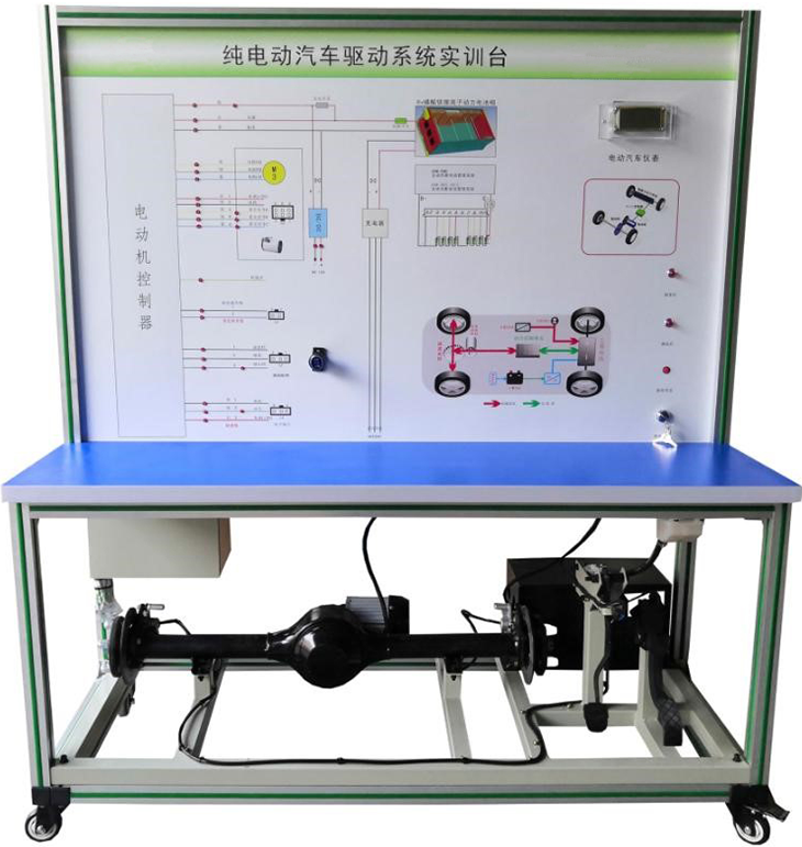檢測(cè)控制面板(裝有各種檢測(cè)端子,1448×940mm彩色電路圖和工作原理示意圖)、組合儀表、點(diǎn)火開(kāi)關(guān)、電機(jī)控制器、車(chē)載充電器與充電接口、DC-DC轉(zhuǎn)換器、鋰動(dòng)力電池組、電動(dòng)車(chē)電機(jī)(直流無(wú)刷電機(jī))與變速箱、后輪左右液壓制動(dòng)裝置、驅(qū)動(dòng)橋傳動(dòng)裝置、剎車(chē)開(kāi)關(guān)、檔位開(kāi)關(guān)、油門(mén)控制裝置、大電流繼電器、電源總開(kāi)關(guān)、急停開(kāi)關(guān)、輔助蓄電池(12V45AH)、一體化全鋁合金型材搭建的移動(dòng)臺(tái)架(1500×700×1700mm (帶自鎖腳輪裝置,帶安裝檢測(cè)端子的原理面板,面板1448×940mm)、故障考核系統(tǒng)、設(shè)備操作說(shuō)明書(shū)。
