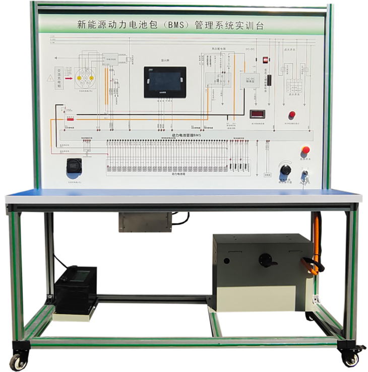 磷酸鐵鋰動力電池包與鐵制電池箱(單體電池3.2V 20AH,24串)、BMS鋰電管理一體機、動力電池包觸摸顯示屏、車載充電機、國標充電插口、國標充電槍、緊急斷電開關、霍爾電流傳感器、直流接觸器(包含充電繼電器、總正繼電器、總負繼電器、預充繼電器)、DC-DC轉(zhuǎn)換器(72V-12V30A)、輔助蓄電池(12V45AH)、放電控制繼電器與放電負載電阻、預充電阻器、可移動實訓臺(1500×700×1700mm 帶自鎖腳輪裝置,帶安裝檢測端子的原理面板,面板1448×940mm)、故障模擬與排除裝置、設備操作說明書。