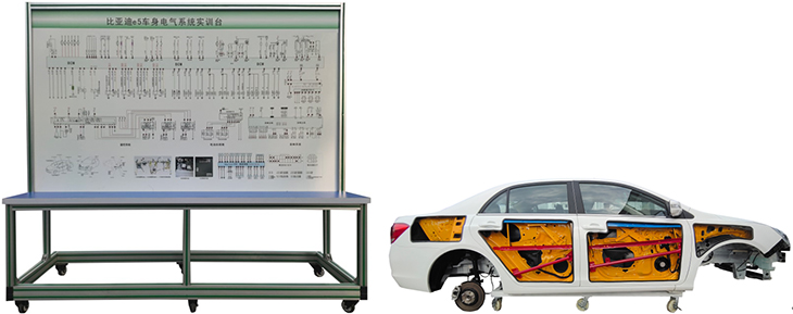 (比亞迪e5 EV450純電動(dòng)汽車(chē))車(chē)身電腦、手剎開(kāi)關(guān)、座椅、牌照燈、閱讀燈、帶移動(dòng)腳輪鋼制底座的汽車(chē)車(chē)殼總成(局部解剖)左前車(chē)窗電機(jī)、右前車(chē)窗電機(jī)、左后車(chē)窗電機(jī)、右后車(chē)窗電機(jī)、左前鎖塊、右前鎖塊、右后鎖塊、左后鎖塊、電源總開(kāi)關(guān)、保險(xiǎn)絲盒、車(chē)窗組合開(kāi)關(guān)、中控鎖開(kāi)關(guān)、組合開(kāi)關(guān)、左右前大燈總成、左右前霧燈、左右轉(zhuǎn)向燈、左右組合尾燈、牌照燈、燈光開(kāi)關(guān)、倒車(chē)燈開(kāi)關(guān)、危險(xiǎn)燈開(kāi)關(guān)、剎車(chē)開(kāi)關(guān)、雨刮總成、雨刮開(kāi)關(guān)、雨刮繼電器、洗滌電機(jī)、喇叭、喇叭開(kāi)關(guān)、電動(dòng)后視鏡與開(kāi)關(guān)、音響與導(dǎo)航總成、音響揚(yáng)聲器(6寸200W)、DC12開(kāi)關(guān)電源、點(diǎn)火開(kāi)關(guān)、一體化全鋁合金型材搭建的移動(dòng)臺(tái)架(2040×650×1800mm (帶自鎖腳輪裝置,帶安裝檢測(cè)端子的原理面板,面板1988×1220mm)、故障設(shè)置和考核系統(tǒng)、設(shè)備操作說(shuō)明書(shū)。