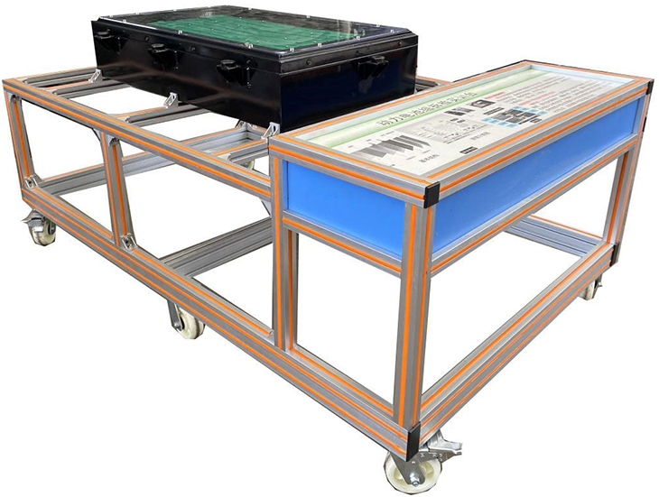 動力電池包及BMS總成、緊急斷電開關(guān)、維修開關(guān)、霍爾電流傳感器,直流接觸器(包含充電繼電器、總正繼電器、總負(fù)繼電器、預(yù)充繼電器),單體電池充電器,一體化全鋁合金型材搭建的移動臺架(1880×1160×1300mm