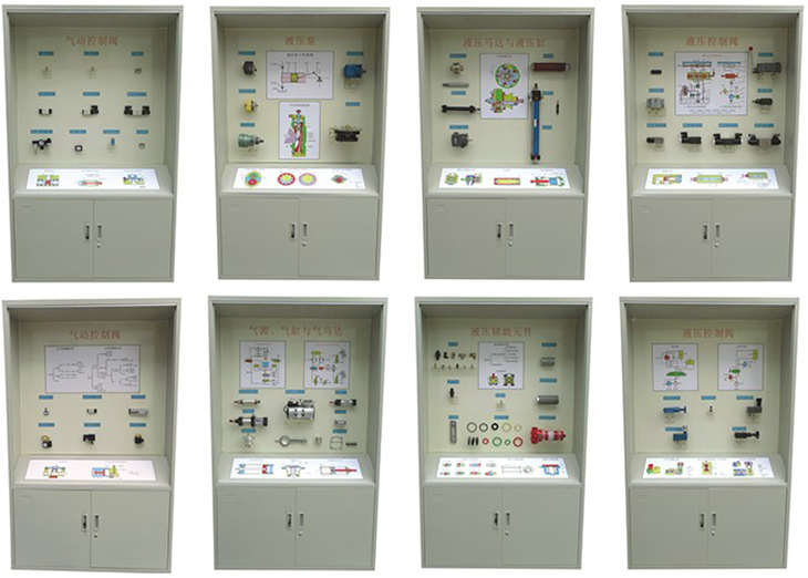 氣動(dòng)液壓陳列柜,氣動(dòng)液壓示教陳列柜,透明液壓PLC控制實(shí)訓(xùn)臺(tái)、氣動(dòng)PLC控制實(shí)訓(xùn)臺(tái)、智能化液壓伺服控制系統(tǒng)實(shí)驗(yàn)裝置、挖掘機(jī)液壓系統(tǒng)實(shí)訓(xùn)裝置、液壓元件拆裝實(shí)訓(xùn)臺(tái)是《液壓與氣壓傳動(dòng)》課程的實(shí)驗(yàn)場(chǎng)所,承擔(dān)機(jī)械控制及其自動(dòng)化、船舶與海洋工程、電氣工程及