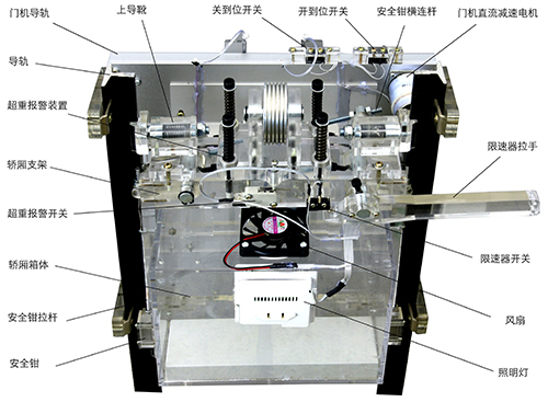 本電梯是根據(jù)最常見的升降式電梯結(jié)構(gòu),采用鋼管焊接一體而成,表面經(jīng)過磷化噴塑處理、具有良好的結(jié)構(gòu)剛性。為了便于教學(xué),電梯主要機(jī)構(gòu)部件均采用透明有機(jī)材料制成 (包括:限速器、轎廂、層門及門廳立面、轎門、轎廂、機(jī)房底板、導(dǎo)軌支架……)為了使電梯運(yùn)行控制更加精密可靠逼真,設(shè)計了與實(shí)際電梯比例縮小的鋁合金轎廂對重導(dǎo)軌、及轎門門機(jī)導(dǎo)軌、層門導(dǎo)軌。