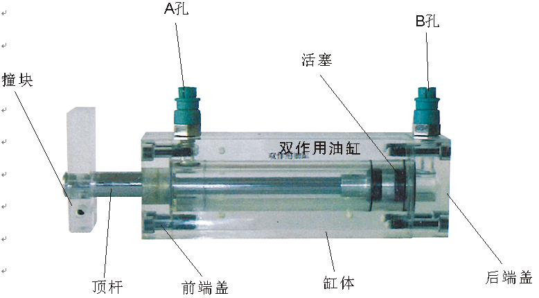 2、雙作用油缸的缸體,端蓋,行程撞塊,撞塊支承等均采用了進(jìn)口透明有機(jī)玻璃材料。頂桿采用了45#中碳鋼,并配合油接頭,密封圈,內(nèi)六角螺絲等標(biāo)準(zhǔn)件精制而成。能通過(guò)它明確地觀察活塞、頂桿、油封、油孔等結(jié)構(gòu)及其運(yùn)行過(guò)程。