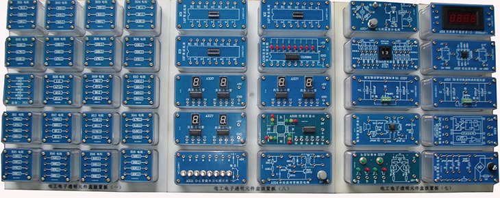 提供電工電子透明實訓(xùn)模塊,可以完成直流電路、模擬電子技術(shù)、數(shù)字電子技術(shù)和電子綜合應(yīng)用實訓(xùn)項目。實訓(xùn)模塊面板采用PCB板制作而成,器件和信號接口均已引至板上的專用插座,實訓(xùn)模塊有四個彈性插腳,與專用實訓(xùn)孔板配套使用。