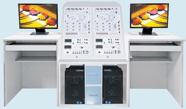 雙工位同步教學(xué)平臺:尺寸:800×600×1200mm 材質(zhì):ABS 厚度5毫米,平臺后部采用透明有機玻璃;平臺下端兩側(cè)擺放電腦主機,主機中間另有兩個抽屜存放實驗器材,平臺上部擺放2個工位的數(shù)/模電同步互動教學(xué)系統(tǒng)硬件模塊。 |