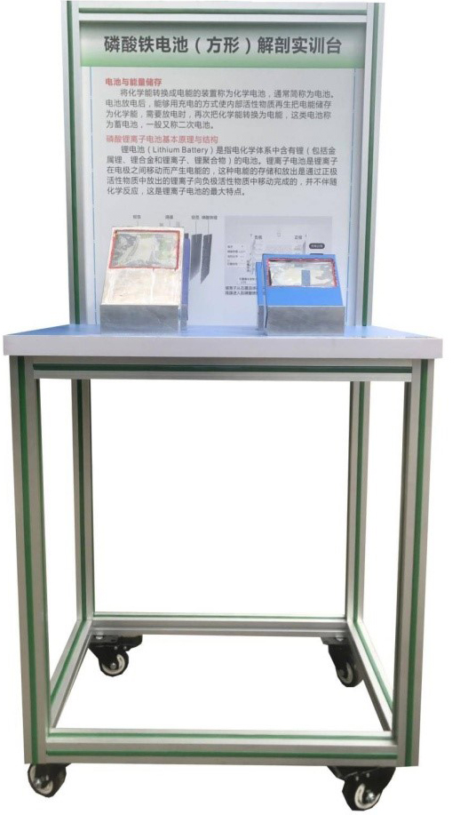 磷酸鐵鋰動(dòng)力電池3.2V20AH(兩件,其中一件解剖),酸鐵鋰動(dòng)力電池3.2V50AH(兩件,其中一件解剖),單體電池充電裝置,可移動(dòng)平臺(tái)和教板。