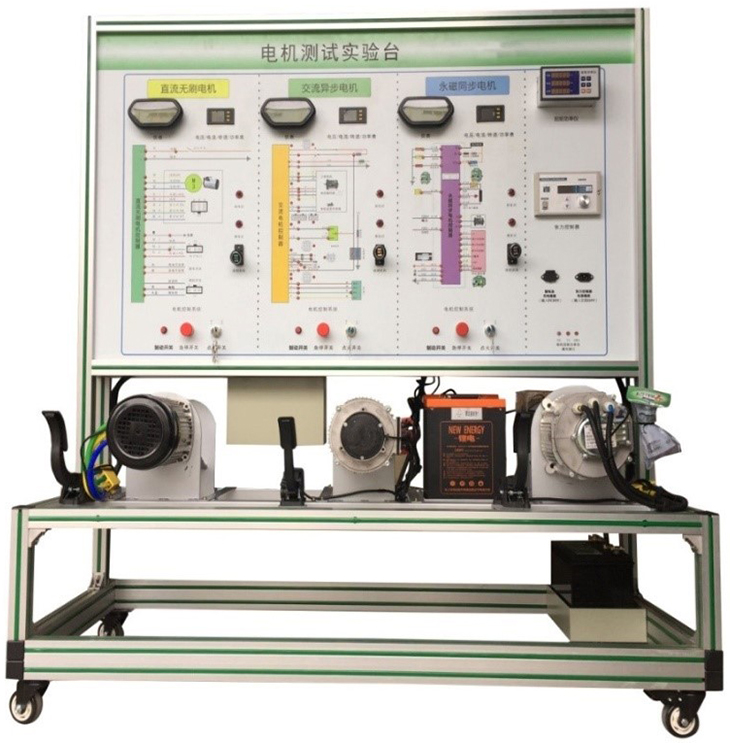 檢測(cè)控制面板(裝有各種檢測(cè)端子,1448×940mm彩色電路圖和工作原理示意圖)、組合儀表、點(diǎn)火開(kāi)關(guān)、電機(jī)控制器、車(chē)載充電器與充電接口、DC-DC轉(zhuǎn)換器、鋰動(dòng)力電池組、電動(dòng)車(chē)電機(jī)(包含三種電動(dòng)車(chē)常用電機(jī):60V2.2KW3000rpm永磁同步電機(jī),60V2.2KW3000rpm交流異步電機(jī),60V2KW3000rpm直流無(wú)刷電機(jī))、剎車(chē)開(kāi)關(guān)、檔位開(kāi)關(guān)、油門(mén)控制裝置、大電流繼電器、電源總開(kāi)關(guān)、急停開(kāi)關(guān)、輔助蓄電池(12V45AH)、電機(jī)性能檢測(cè)系統(tǒng)(數(shù)顯電壓電流表、轉(zhuǎn)速表、扭矩表、功率表、磁粉制動(dòng)器、測(cè)試上位機(jī)軟件)、電機(jī)及扭矩傳感器與磁粉制動(dòng)器連接器、SX-96B數(shù)顯表、一體化全鋁合金型材搭建的移動(dòng)臺(tái)架(1500×700×1700mm
