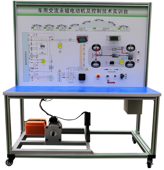 檢測控制面板(裝有各種檢測端子,1448×940mm彩色電路圖和工作原理示意圖)、組合儀表、點(diǎn)火開關(guān)、電機(jī)控制器、車載充電器與充電接口、DC-DC轉(zhuǎn)換器、鋰動力電池組、電動車電機(jī)(永磁同步電機(jī))、剎車開關(guān)、檔位開關(guān)、油門控制裝置、大電流繼電器、電源總開關(guān)、急停開關(guān)、輔助蓄電池(12V45AH)、一體化全鋁合金型材搭建的移動臺架(1500×700×1700mm