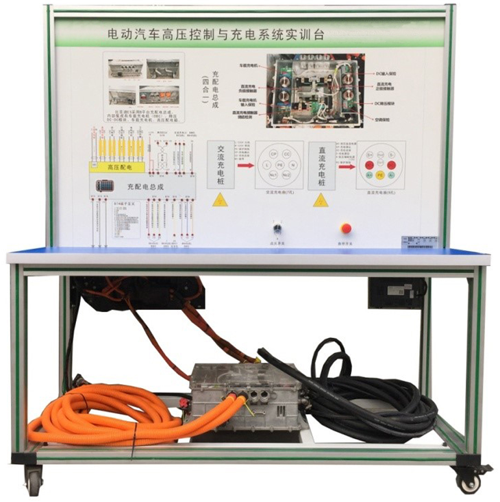高壓電控總成,國標(biāo)充電槍與充電座、車載充電機(jī)、高壓配電箱(帶各類高壓繼電器與保險(xiǎn)絲)與充電系統(tǒng)、高壓電控總成、漏電傳感器模塊、絕緣傳感器模塊、安全維修塞模塊、漏電模擬操作單元、高壓安全系統(tǒng)操作單元、操作控制臺、訓(xùn)練控制按鈕、一體化全鋁合金型材搭建的移動臺架(1500×700×1700mm