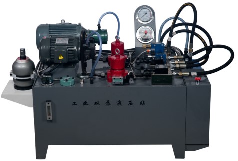 工業(yè)雙泵液壓站采用兩套液壓泵機(jī)組,其中一套為高壓定量柱塞泵機(jī)組,另一套為限壓式變量葉片泵機(jī)組,每套泵機(jī)組上均安裝有系統(tǒng)調(diào)壓組件,配套泵站控制單元,泵站系統(tǒng)中配置有系統(tǒng)壓力表、風(fēng)冷卻器、蓄能器、液位控制繼電器、油溫液位計(jì)、壓力管路過(guò)濾器、空氣濾清器等。