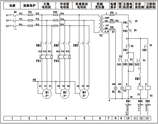 刀架快速移動電機(jī)M3采用點動控制,按下SB3,KM3吸合,其主觸頭閉合,快速移動電機(jī)M3啟動,松開SB3,KM3釋放,電動機(jī)M3停止。