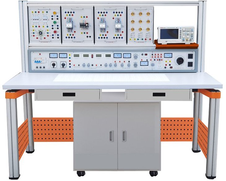 電工實(shí)驗(yàn)臺(tái),電工技術(shù)綜合實(shí)驗(yàn)裝置,通過(guò)實(shí)驗(yàn)教學(xué),使學(xué)生掌握電工技術(shù)方面的基本知識(shí)與技能,培養(yǎng)學(xué)生實(shí)際操作能力和應(yīng)用技能、培養(yǎng)學(xué)生分析和解決問(wèn)題的基本能力,為后續(xù)專業(yè)課程打好基礎(chǔ)。電工實(shí)驗(yàn)臺(tái)具有較完善的安全保護(hù)措施,較齊全的功能(詳見(jiàn)實(shí)驗(yàn)臺(tái)結(jié)構(gòu)簡(jiǎn)介)。實(shí)驗(yàn)桌中央配有通用九孔萬(wàn)能插件板,九孔萬(wàn)能插件板主體由ABS注塑而成,表面布有九孔成一組相互聯(lián)通的插孔,九孔萬(wàn)能插件板內(nèi)部?jī)?nèi)嵌126組銅質(zhì)九孔一體成型嵌件。實(shí)驗(yàn)中的弱電模塊必須以獨(dú)立封裝的透明元件盒為單一模塊,元件盒統(tǒng)一都能配合九孔萬(wàn)能插件板像搭積木一樣的形式自由搭建組合電路,元件盒盒體透明,內(nèi)裝元件直觀性好,盒蓋印刷電路圖防刮耐磨,符號(hào)美觀清晰。元件盒盒體與盒蓋采用較科學(xué)的壓卡式結(jié)構(gòu),維修拆裝方便。元器件放置在實(shí)驗(yàn)桌下邊儲(chǔ)存柜內(nèi),大大提高了管理水平,規(guī)劃化程度,大大減輕了教師實(shí)驗(yàn)準(zhǔn)備工作。