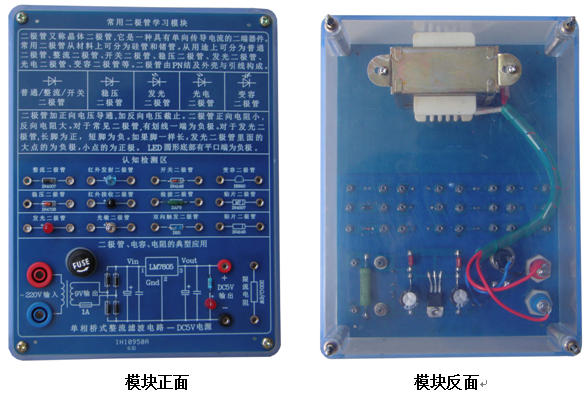 提供二極管、電容、電阻的綜合應(yīng)用電路:單相橋式整流濾波電路-DC5V電源的產(chǎn)生電路,帶有熔絲保護(hù)及發(fā)光二極管指示,通入單相AC220市電即可工作(模塊設(shè)有單相電源變壓器),同時(shí)該DC5V電源可為其他模塊檢測(cè)供電之用。