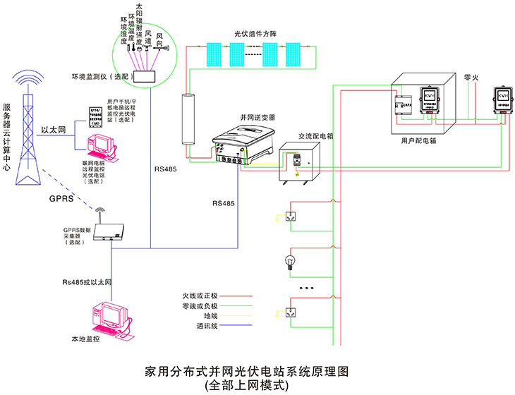 在晴朗的白天,裝在屋頂上的光伏組件發(fā)出的直流電經(jīng)過并網(wǎng)逆變器逆變成與電網(wǎng)同頻率同相位的單相交流電給負(fù)載進(jìn)行供電,在夜晚或陰雨天等太陽光照不足的情況下,系統(tǒng)處于待機(jī)狀態(tài),負(fù)載用電全部來自電網(wǎng)。您可以通過系統(tǒng)監(jiān)控軟件來實(shí)時(shí)查看系統(tǒng)的運(yùn)行狀態(tài)和故障信息,或者是選配遠(yuǎn)程通訊數(shù)據(jù)采集器,將系統(tǒng)工作數(shù)據(jù)通過GPRS或以太網(wǎng),傳輸?shù)侥氖謾C(jī)、平板電腦或任意一臺(tái)聯(lián)網(wǎng)的電腦,以便于您遠(yuǎn)程實(shí)時(shí)掌控電站的信息。