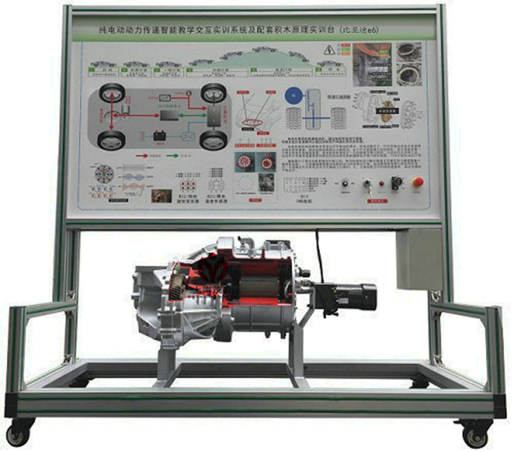 比亞迪e6純電動動力傳遞交互實訓平臺采用比亞迪e6動力傳遞交互實訓系統(tǒng)基于比亞迪e6實車動力總成和原理基礎積木擺放臺構建而成,包括驅動電機、變速箱、P檔電機、車速傳感器、差速器、水溫傳感器等,配有經噴涂油墨、裝配具有保護功能的檢測端子,可測量電壓,電阻,波形等信號。適用于中高職院校、技工院校、新能源培訓機構對于比亞迪e6汽車動力總成的教學培訓。