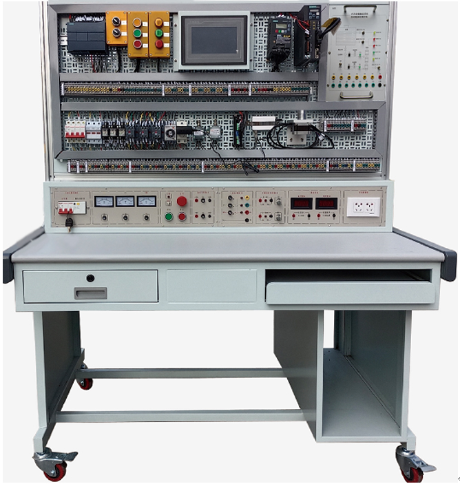 自動化控制技能實訓(xùn)臺主要用于訓(xùn)練員工的自動化應(yīng)用綜合能力,訓(xùn)練內(nèi)容包含:PLC通訊技術(shù)、PLC編程、觸摸屏應(yīng)用、變頻器控制技術(shù)、伺服控制技術(shù)等。實訓(xùn)臺底部裝有帶剎車的腳輪,方便移動和固定。電氣元器件的布置應(yīng)合理美觀,并預(yù)留有一定空間,以便后期擴展其他培訓(xùn)內(nèi)容。