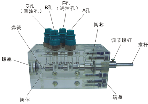 2、溢流閥結構上參考了國產(chǎn)P-63B型低壓直動式溢流閥,其閥體閥蓋、鎖緊螺母、調(diào)節(jié)螺母、螺塞等采用了進口透明有機玻璃材料精制而成,閥芯、調(diào)節(jié)桿采用了45#中碳鋼材料。并配合彈簧,油接頭,密封圈等標準件裝配而成,通過它可明確地觀察到閥芯、彈簧、油孔等結構及其運行過程,具有形象逼真,性能可靠等優(yōu)點。它即可作為教學模型,也可以作為液壓實驗元件進行實驗演示。