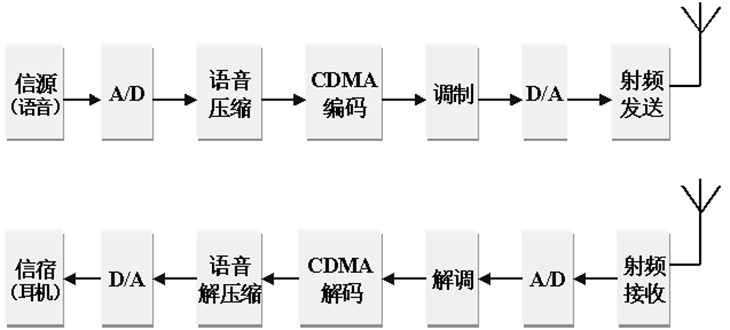 (2)收端:接收、下變頻、解調(diào)、CDMA譯碼、擴(kuò)張、還原語音。