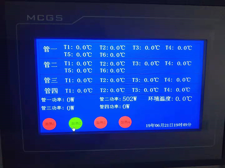 配有四根不同長(zhǎng)度和直徑的電鍍紫銅管,管內(nèi)設(shè)置電加熱器;每根管子的表面裝4~6支測(cè)溫傳感器,以測(cè)定其表面平均溫度,測(cè)溫傳感器采用進(jìn)口DS18B20;每根橫管電加熱器配備電子集成固體調(diào)壓模塊無(wú)機(jī)調(diào)節(jié)。測(cè)試儀表箱設(shè)有(每根橫管電加熱器)數(shù)顯功率表;所有測(cè)試數(shù)據(jù)由7寸觸摸屏同屏顯示,不銹鋼實(shí)驗(yàn)支架。