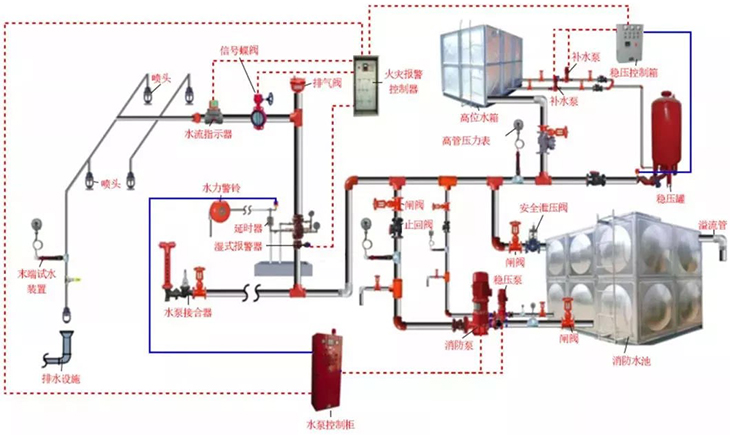 消防泵、穩(wěn)壓泵、氣壓罐、閘閥、消防水箱、水泵控制電箱、管網(wǎng)壓力表、電接點壓力表、泄壓閥、柔性接頭、過濾器、泄水閥、DN100鍍鋅管、濕式報警閥組、干式閥組、預(yù)作用閥組、雨淋閥組、末端試水裝置、各種噴頭、信號蝶閥、水指、排氣閥、末端試水箱 |