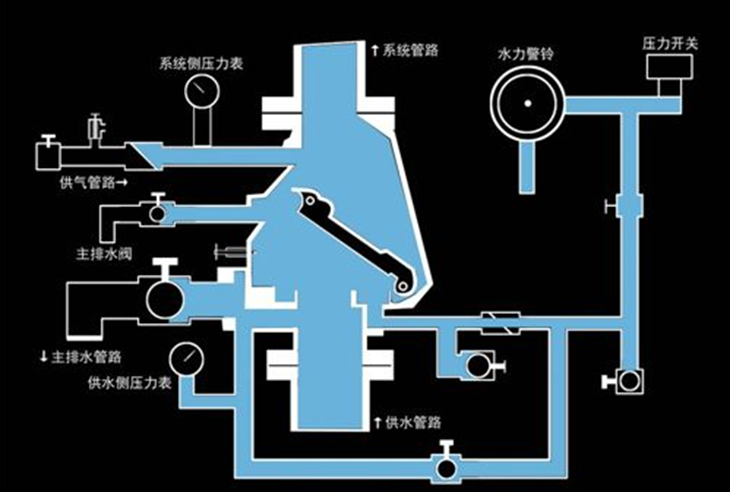 當(dāng)系統(tǒng)處于伺應(yīng)狀態(tài)時,座圈上的溝槽小孔被閥瓣蓋住封閉,通往水力警鈴的報警水道被堵死;當(dāng)上、下壓力差達(dá)到一定數(shù)值,閥瓣才開啟(差壓啟動),水就從供水側(cè)流向系統(tǒng)側(cè),警鈴報警,滅水系統(tǒng)噴水;當(dāng)上、下壓力頻繁開啟,在閥瓣上設(shè)有小補水閥,當(dāng)系統(tǒng)側(cè)管網(wǎng)有微小滲漏或水源壓力有波動時,可以通過補水閥給管網(wǎng)補水,平衡上、下腔壓力,穩(wěn)定了閥瓣,從而避免了誤報警。