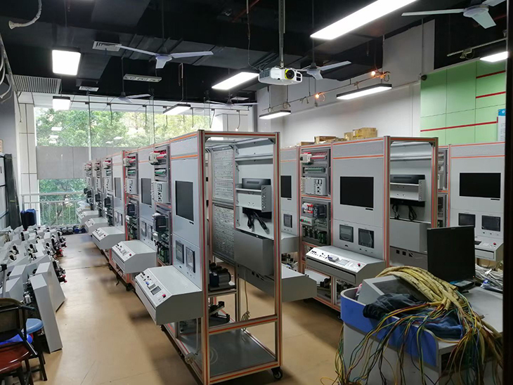 ▲實訓臺架左側設有上下兩層掛箱,可以放置機床考核模塊和直流調速模塊,臺架中間上部設有電腦顯示器,智能考核答題器、觸摸屏。中間中部設有電源控制屏,上平面用于放置實訓指導書,工具等,斜面裝有智能電源控制系統(tǒng),公用按鈕和指示燈等,鍵盤、鼠標抽屜設置于控制屏底部,中間最下部設有電腦主機托板,配有網孔板網孔板,裝有實訓所需的各種電氣元器件、PLC主機、變頻器主機、線槽、接線端子等,公共按鈕和指示燈引線均引至到接線端子上,方便學生的接線和操作。實訓臺架左下部設有兩層托板用于放置實訓電機和步進電機控制模型。