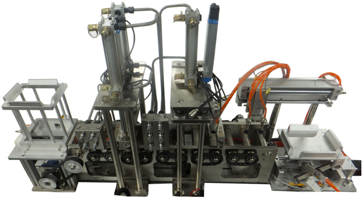 下料實(shí)訓(xùn)模塊由真空吸盤(pán),無(wú)桿氣缸、雙聯(lián)氣缸、步進(jìn)電機(jī)、機(jī)械結(jié)構(gòu)件采用硬鋁精加工,表面噴砂處理等組成。 |